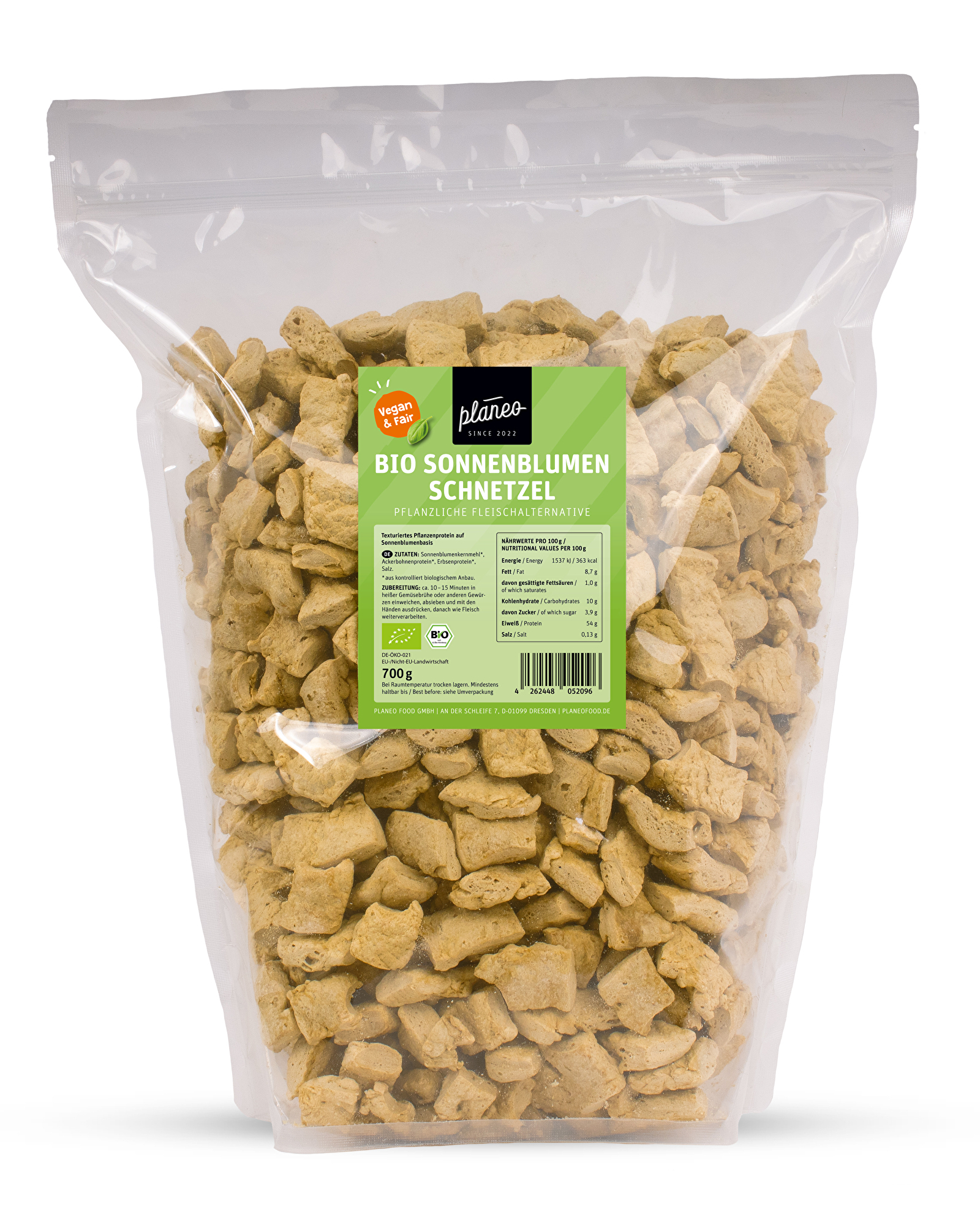 Die Bio Sonnenblumen Schnetzel von Planeo sind die ideale pflanzliche Eiweißquelle für deine vielfältige Küche. Die Schnetzel sind aus hochwertigem Sonnenblumen-, Erbsen- und Ackerbohnenprotein hergestellt und überzeugen durch ihren neutralen Geschmack. Sie lassen sich nach Belieben würzen und verarbeiten. Das Trockenprodukt ist besonders ergiebig, du musst es einfach einweichen und weiterverarbeiten. Ob in herzhaften Pfannengerichten, Saucen oder als Fleischalternative, die Schnetzel passen sich jeder Rezeptidee an und liefern eine Extraportion Protein. Dabei ist die Verpackung wieder verschließbar.