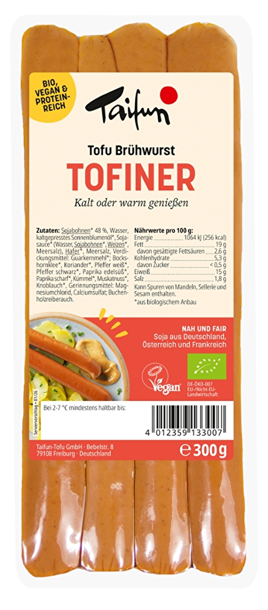 Der Klassiker im veganen Gewand - die Tofiner von Taifun. Einfach drei bis vier Minuten im Wasserbad erhitzen, mit Senf servieren und frisches Brot dazu reichen. Die klassische Brotzeit in vegan! Auch als Eintopf oder Suppenbeilage eignen sich die veganen Wiener hervorragend.