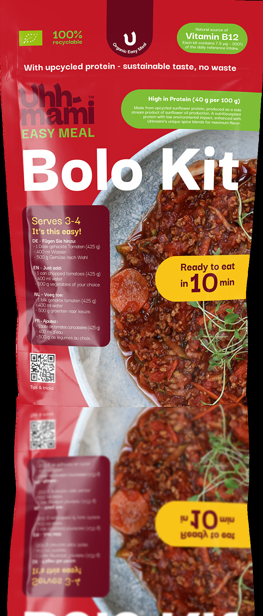 Das Bolo Kit von Uhhmami ist eine reichhaltige Mahlzeit für bis zu vier Personen. Eine schnelle Zubereitung durch das Hinzufügen von Wasser, Gemüse nach Wahl und gehackten Tomaten garantiert ein Gericht, das vom italienischen Klassiker inspiriert ist. Dennoch kann das Kit nicht nur für eine klassische Pasta Bolognese eingesetzt werden, sondern auch als Basis vieler weiterer Gerichte wie beispielsweise Aufläufe dienen.
